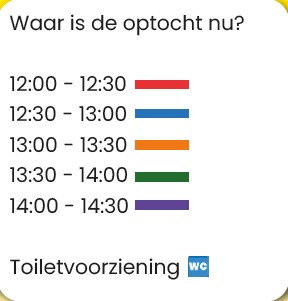 Geniet van de verschillende eet- en drinkgelegenheden langs de route; de bijdrage van deze ondernemers helpt de optocht gratis toegankelijk te houden. Op meerdere locaties vind je ook openbare toiletten.