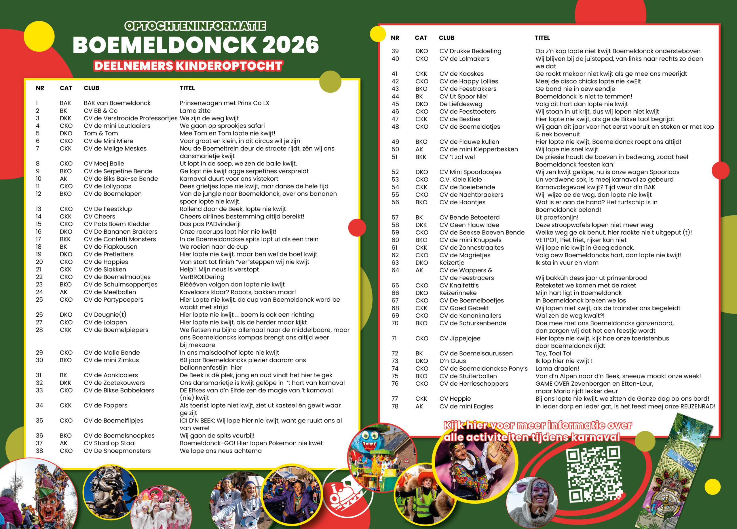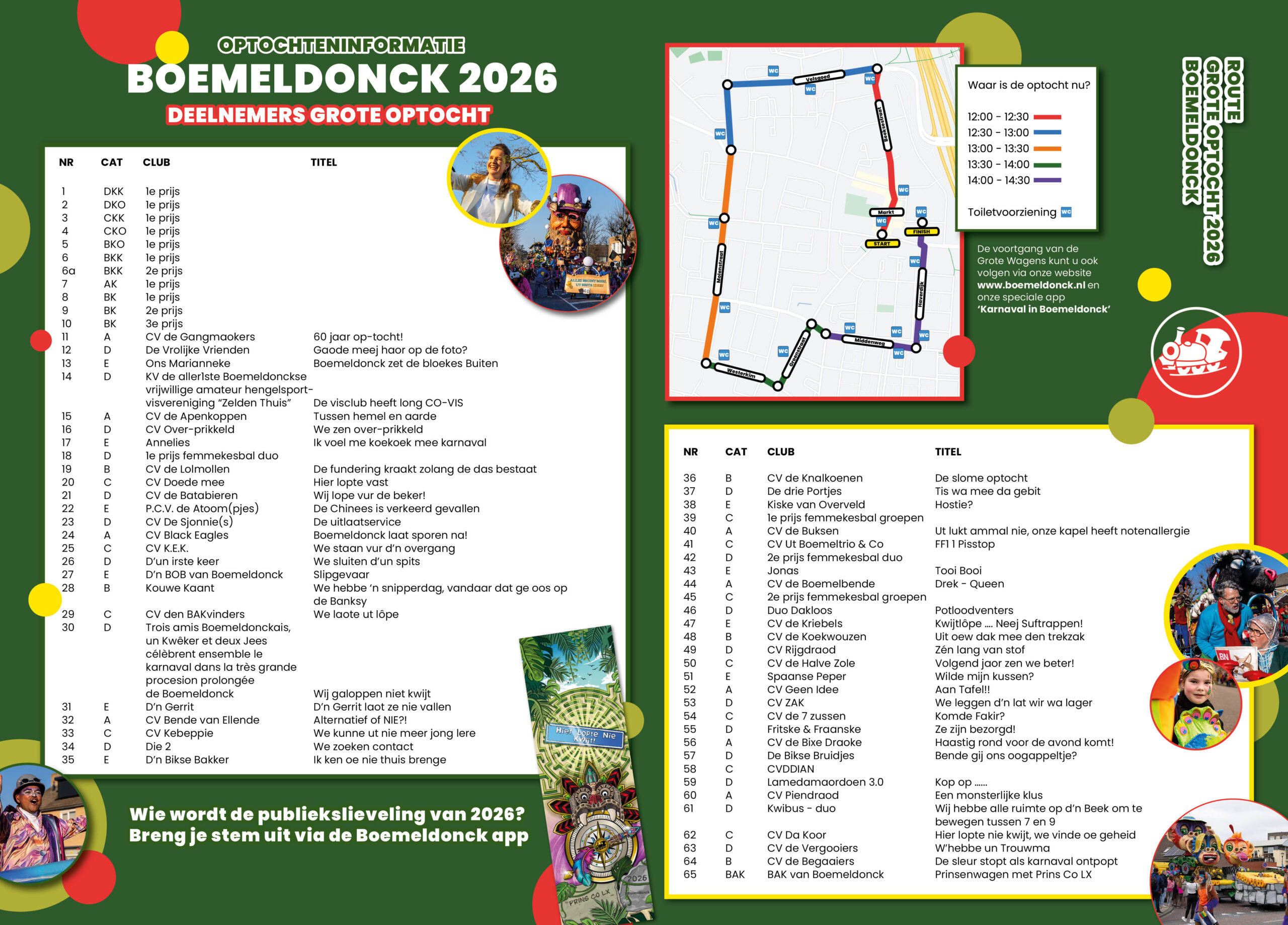 In de BAK-krant zit dit jaar weer een los inlegvel met de optochtdeelnemers. Ideaal om bij de hand te houden als je de optocht gaat bekijken! Zo weet je welke club met welk motto aan je voorbijrijdt en heb je een mooi overzicht van alle categorieën.