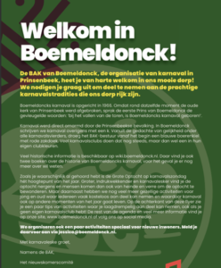 Namens de BAK van Boemeldonck nodigt “Het Nieuwkomerscomité” u als nieuwe inwoner(s) van Boemeldonck graag uit om aanwezig te zijn bij de start van het karnavalsseizoen 2025-2026. Natuurlijk bent u van harte welkom bij de Prinsenzitting op vrijdag 14 november vanaf 20.30 in de toneelzaNieuwkomers Flyer V3al van welzijnsgebouw De Drie Linden, Heisprong 15 in Prinsenbeek.